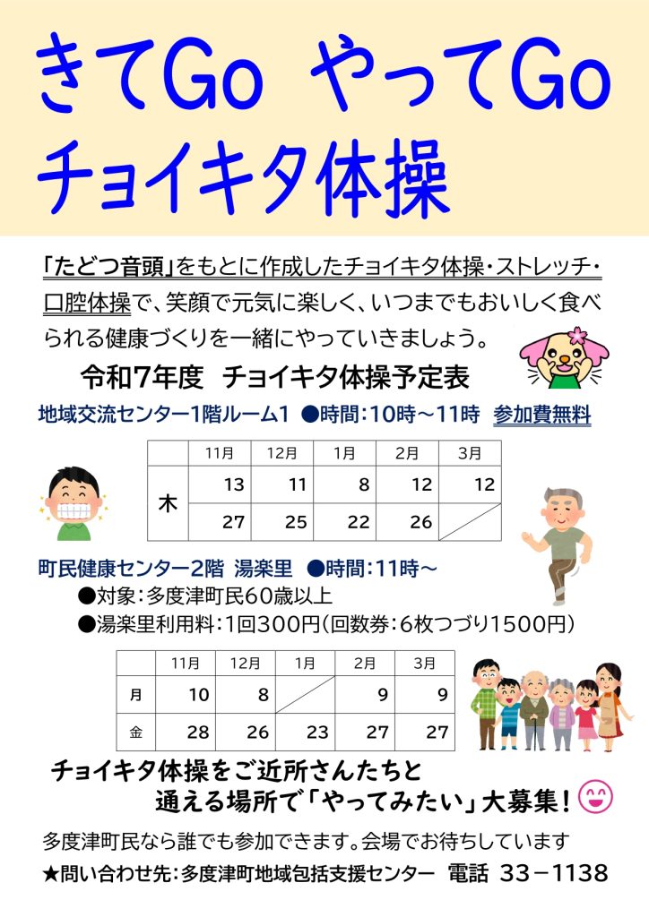 その他のお知らせ 11月からのチョイキタ体操予定表 tadog 2025年11月4日 5月からスタートした地域交流センターのチョイキタ体操ですが、きつくない体操なので続けてきてくださる方が増えています。急に寒くなり家から出るのがおっくうになる気候となりましたが、チョイキタフレンズ、職員一同お待ちしております。 多度津町民ならどなたでも参加OK!飲み物、タオル持参でお越しください。 ※湯楽里でも月2回チョイキタ体操を実施中。湯楽里利用料が必要となります。 行事カレンダー