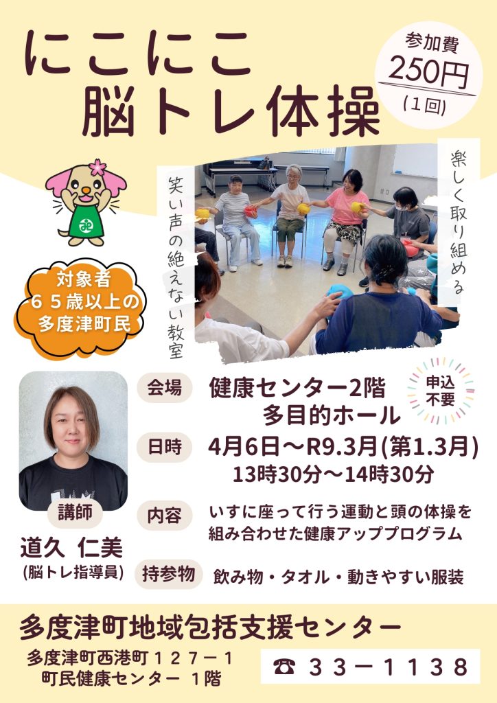 イベント・講座 にこにこ脳トレ体操 tadog 2026年3月23日 いすに座って行う運動と頭の体操を組み合わせた新しい教室が始まります! ●初回は4/6(月) 午後1時30分~ 健康センター2階で行います。 65歳以上の町民なら参加OK。参加費250円です。 申込不要ですので気軽にご参加ください。お待ちしています。 行事カレンダー